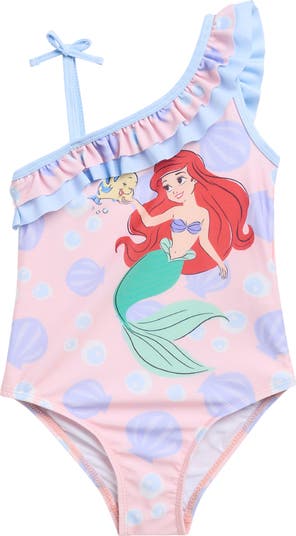 Make their next beach day extra fun with this one-piece swimsuit styled with a frilly one shoulder and featuring their favorite cartoon mermaid, Ariel.