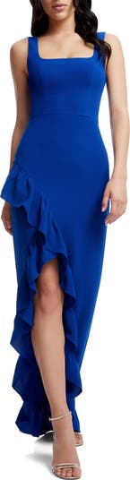 Ruffle trim highlights the dramatic side slit of a sleeveless gown that's destined to make a statement.
