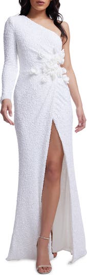 Floral appliqués bloom around the side cutout of this stunning gown that shimmers in snowy sequins and features a one-shoulder silhouette balanced by a thigh-high slit.