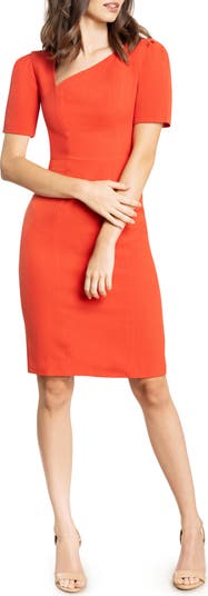 Step away, stylistically, from the standard sheath dress and stand out in this version, which makes an artful statement with its off-center neckline.