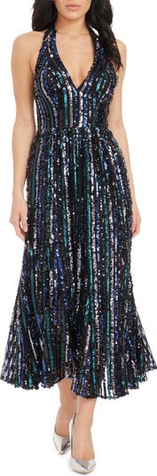 Sparkling stripes animate a toast-worthy midi cocktail dress cut with a halter neckline that also enhances your exit.