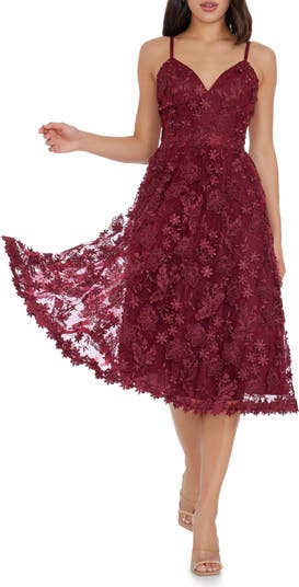 Make a statement on the dance floor in this enchanting floral embroidered lace dress designed with a voluminous fit-and-flare silhouette.