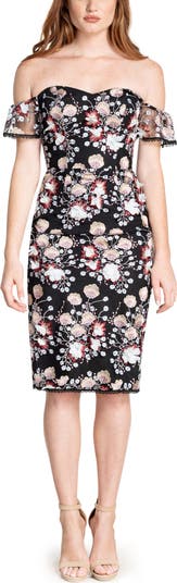 An embroidered landscape dotted with fluttering flowers skims every curve in a fitted cocktail dress designed to show off your shoulders.