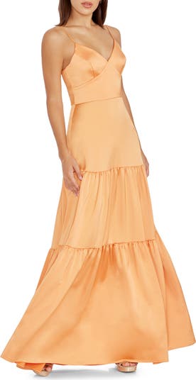Glossy satin and a subtle shade create a quietly enchanting aesthetic for this tiered gown that will inspire toasts.
