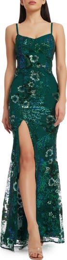 This striking gown shimmers in glittering sequins arranged in a floral pattern and is styled in a slinky mermaid silhouette with a thigh-high slit.