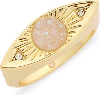 Ward off misfortune with this elegant band ring that features a druzy–centered evil eye on the top.