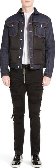 A rigid denim trucker jacket pieced with a poly-coated quilted body combines traditional workwear designs with extra warmth for getting you through from fall to spring.