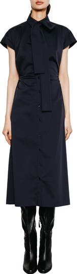 A tied neck and a shaped waist polish the presentation of a work-ready shirtdress cut from a crisp cotton blend.