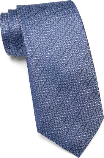 A neat medallion design adds understated distinction to a woven silk tie that adds a smart, polished finish to any formal or semiformal look.