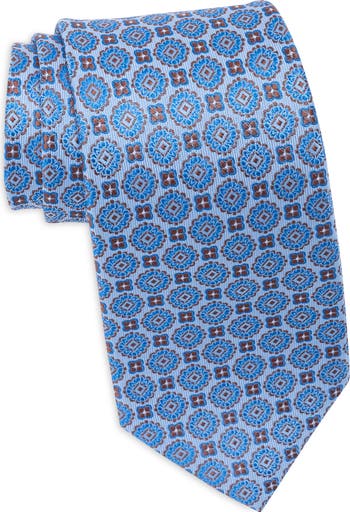 A tonal medallion design adds understated distinction to a woven silk tie that adds a smart, polished finish to any formal or semiformal look.