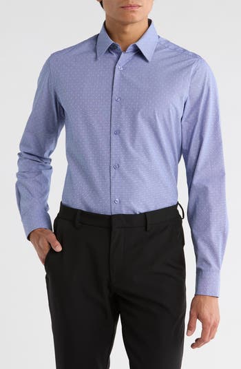 Go from sales pitches to 5 o’clock drinks at your favorite bar effortlessly in this slim-fit dress shirt cut from textured dot cotton with added stretch.