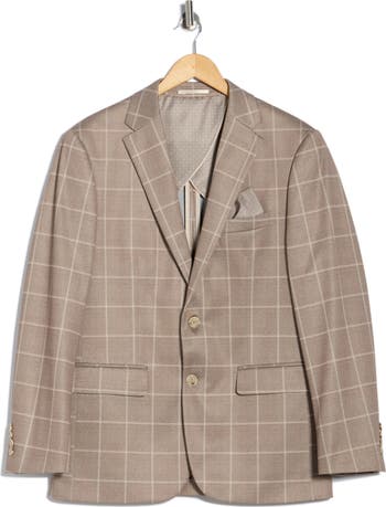 Four-way stretch knit in a windowpane pattern distinguishes a slim-fit sport coat tailored with clean lines supported by light padding in the shoulders. Styled with traditional notched lapels and lightly fitted in the waist, it adds a smart finish to any semiformal look.