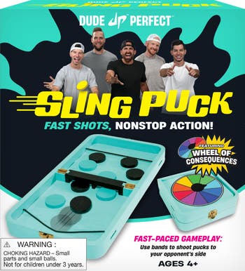 Experience the thrill of the Dude Perfect game, with this version where players use elastic bands to shoot pucks across the board in a race to clear their side
