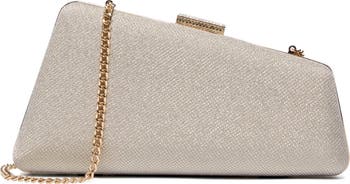 A jewel-encrusted clasp and geometric profile add striking elements to an evening-ready clutch suspended from an optional chain strap for hands-free carry.