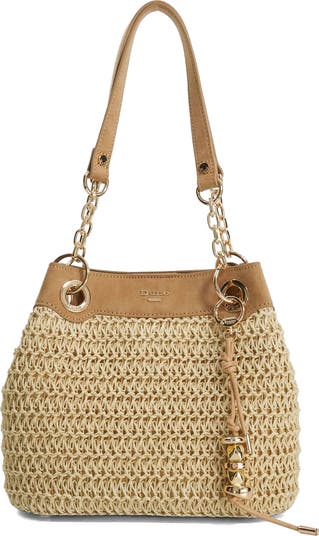 A beaded goldtone charm swings from one of the over-the-shoulder handles of this breezy raffiat tote.