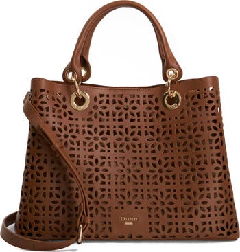 Glinting logo hardware and laser-cut perforations bring depth and dimension to a faux-leather tote featuring multiple compartments and an optional crossbody strap for on-the-go convenience.