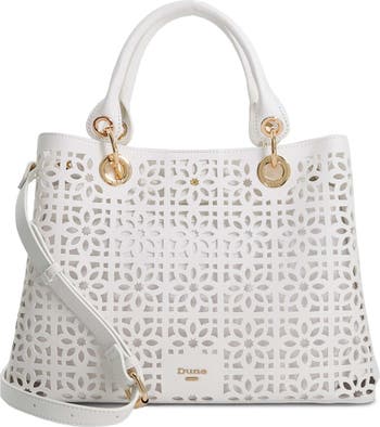 Glinting logo hardware and laser-cut perforations bring depth and dimension to a faux-leather tote featuring multiple compartments and an optional crossbody strap for on-the-go convenience.