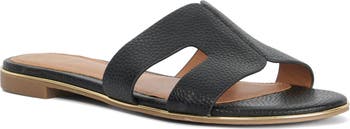 A woven vamp strap crafted from grained faux leather distinguishes a slide sandal that delivers unmistakable summer style to warm-weather looks.