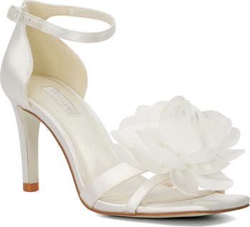 A frothy floral appliqué adds modern elegance to a luxe satin sandal set on a cushioned footbed for comfortable wear from the ceremony to the first dance.