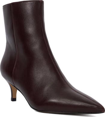 A pointy toe and streamlined profile bring timeless sophistication to a luxe leather bootie lofted by a kitten heel for subtle height.