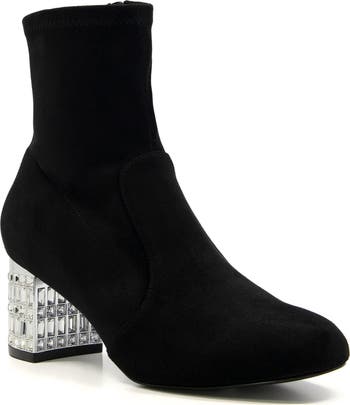 Sparkling crystals covering the block heel add undeniable glamour to this streamlined bootie.