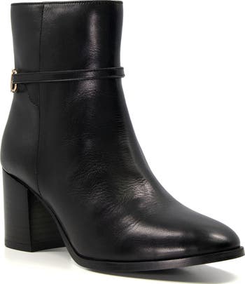 Polished bit hardware gleams on the back of a burnished leather bootie lifted by a just-right block heel.