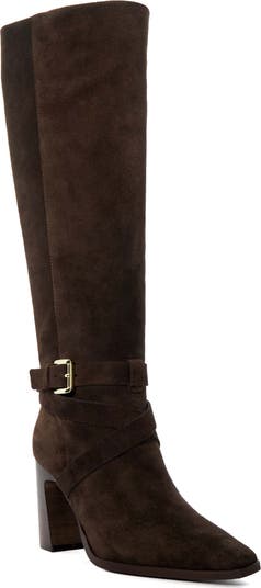 A flashy buckle detail accentuates the wraparound strap of an outfit-elevating suede boot complete with a block heel and pointy toe.