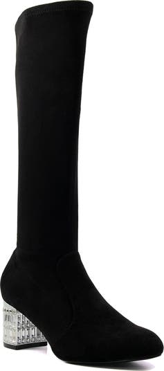 Sparkling crystals covering the block heel add eye-catching glamour to this streamlined knee-high boot.
