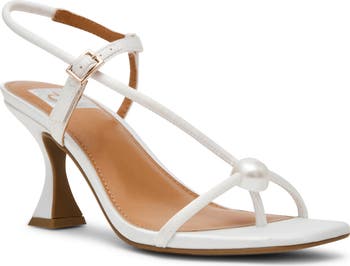 A subtle 'T' silhouette distinguishes the strappy vamp of a charming sandal lofted by a curved, architectural heel that pairs well with casual or elevated looks.