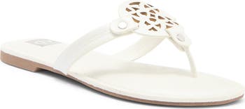Breezy cutouts center a cushioned flip flop sandal haloed by rhinestones for added girly style.