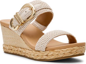 A multitude of textures lend visual interest to a wedge-lofted sandal that's a perfect style refresh for summer-ready looks.