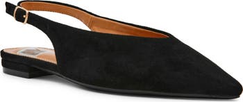An adjustable sligback strap offers a secure fit and retro aesthetic on a streamlined flat featuring a pointed toe for a demure look.