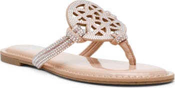 Dainty rhinestones sparkle from this easy-wear slide sandal featuring a strappy vamp with a laser-cut medallion and lightweight memory foam cushioining.