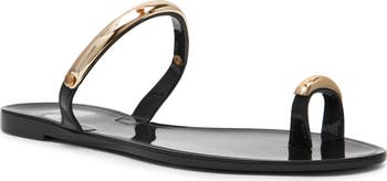 Compliment warm-weather looks with this modern sandal secured by a slim strap and toe loop both defined by polished, golden hardware.