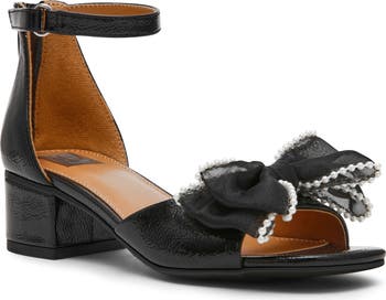 Pearly beads neatly outline the chiffon bow that tops an elegant sandal perfect for parties and special occasions.