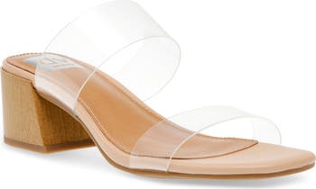 A square toe and flared block heel lend geometric elements to this faux-leather slide sandal topped with wide straps.