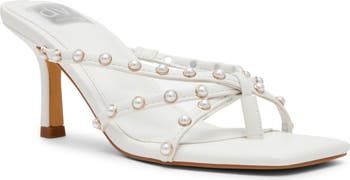 Goldtone rings frame the pearly beads on this strappy sandal set on a just-right heel.