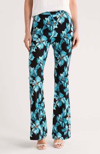 Pull-on pants create a smooth silhouette from the high waist to the flared hems, cut from lightweight fabric and finished with an attention‑stealing print.