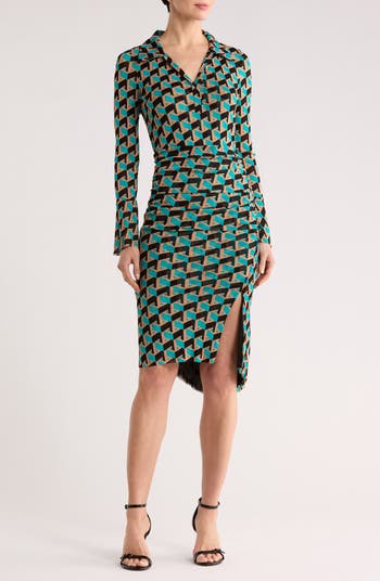 A mesmerizing pattern and wrap-inspired silhouette stay true to the iconic label in this bold dress finished with long sleeves and an asymmetric hem skirt.