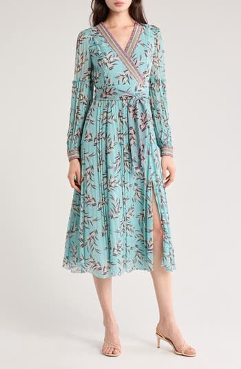 Intricate stitched embroidery outlines the surlice neckline and cuffs of this long-sleeved dress that's fashioned in a faux-wrap silhouette.
