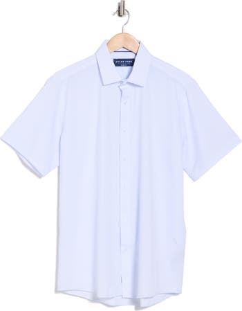 A sporty stretch-blend forms an easy-care dress shirt featuring a modern spread collar and mitered, single-button cuffs.