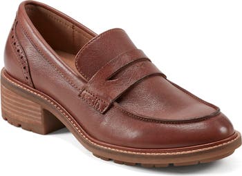 A chunky block heel and softly lugged sole beef up the traditionally streamlined profile of this classic penny loafer detailed with retro perforations tracing the heel counter.