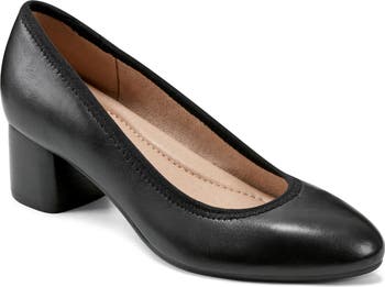 Zigzag stitching trims the elastic topline of this streamlined almond-toe pump lofted on a stacked block heel for a dash of modern whimsy.