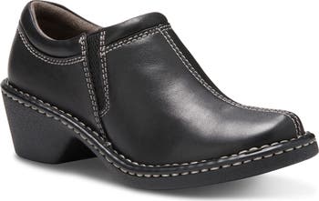 High-contrast stitching distinguishes the smooth leather upper of a low-heeled clog designed with plush cushioning and a shock-absorbing midsole to reduce fatigue and increase comfort.