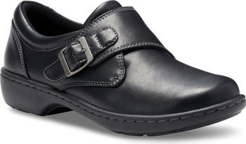 A pair of faux leather slip-on shoes feature comfort insole supports that hug the contours of your foot.
