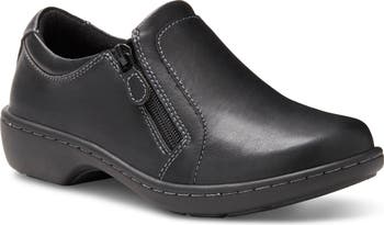 High-contrast stitching distinguishes the faux-leather upper of a slip-on built with plush cushioning and a shock-absorbing midsole to reduce fatigue and increase comfort.