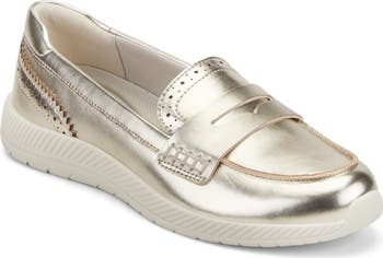 A metallic finish lends shimmer and shine to every stride in this faux-leather loafer built on a flexible sole with arch support for day-to-night comfort.