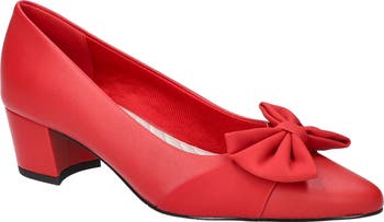A pronounced instep bow highlights the pointy toe on a streamlined faux-leather pump set on a generously cushioned footbed and low block heel.