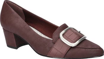A brushed buckle and croc-embossed overlay add striking dimension to a pointy-toe pump featuring underfoot cushioning and a low block heel.