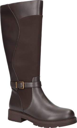 Curvily cut smooth and sueded panels wrap the shaft of this equestrian-style boot detailed with a buckled belt above the ankle and set on a grippy sole.